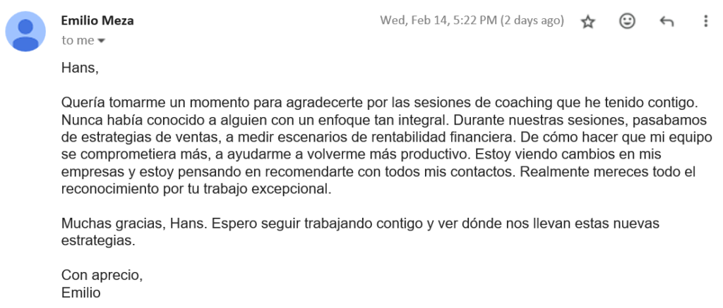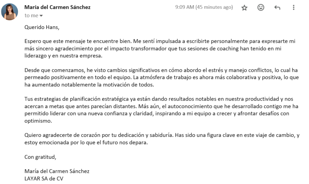 - Más de 21,000 personas han participado de alguno de mis sesiones de coaching, talleres, conferencias o asesorías en España, Suiza, Estados Unidos, México, Brasil, Argentina, Chile, entre otros.