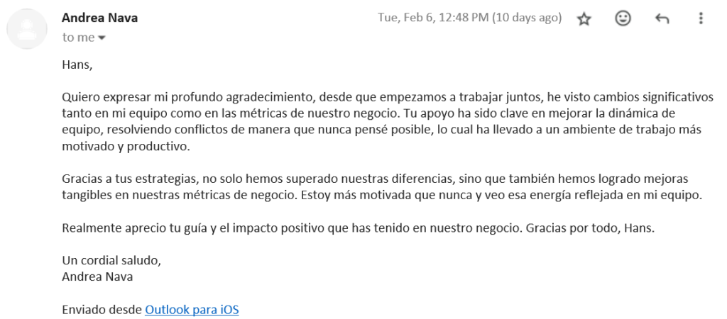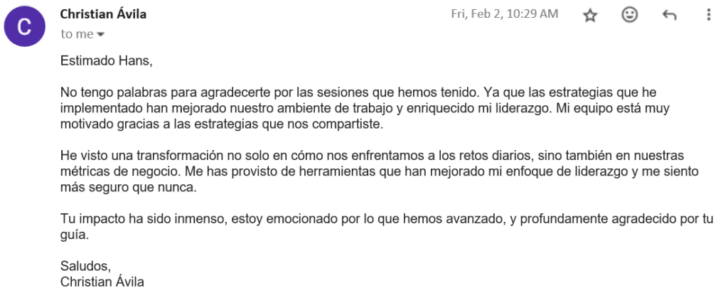 Mis sesiones son 100% personalizadas, centrándome en identificar y fortalecer las áreas críticas como la gestión del cambio, el desarrollo y retención del talento, y la construcción de equipos unidos y eficaces.