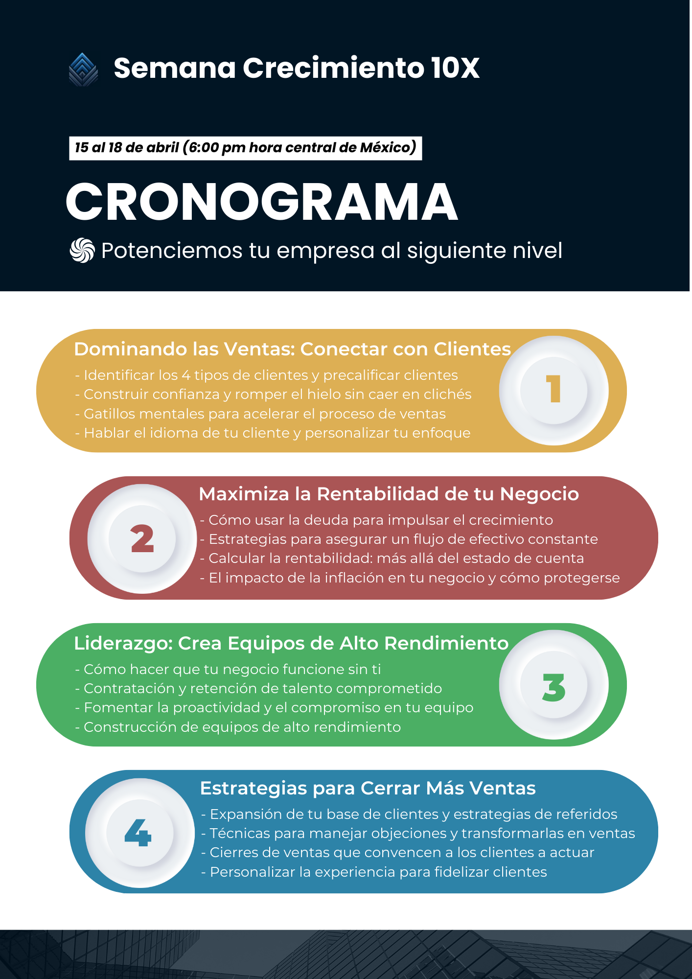 Semana Crecimiento 10X SEMANA CRECIMIENTO 10X Descarga aquí el Cronograma En el siguiente enlace vas a encontrar el cronograma de la Semana Crecimiento 10X Descargar ¿Todavía no estás en la comunidad de WhatsApp? Únete a la comunidad para que no te pierdas la comunicación oficial de las 4 sesiones Entra aquí